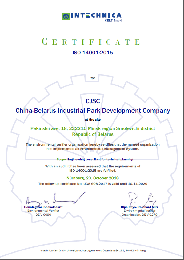 2018年10月21日,中白工業(yè)園區(qū)開發(fā)股份有限公司獲得了ISO14001環(huán)境管理體系標準證書,該證書的獲得將進一步落實園區(qū)生態(tài)化的開發(fā)建設要求,努力實現園區(qū)“國際化產業(yè)園區(qū),生態(tài)化產業(yè)城市”的發(fā)展定位。