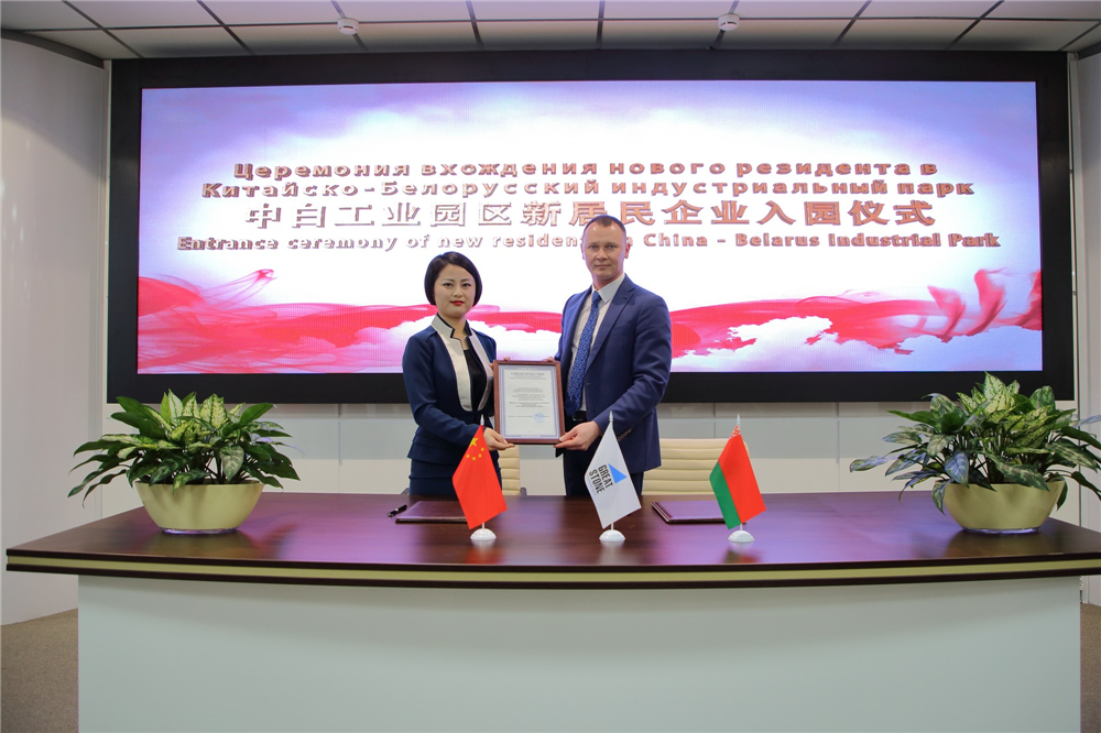 2019年1月3日上午,中白工業(yè)園招商引資工作迎來開門紅,微智國(guó)際(白俄羅斯)有限責(zé)任公司(下稱“微智國(guó)際”)成為園區(qū)的第42家居民企業(yè),中白工業(yè)園管委會(huì)副主任列曉諾克,副主任貢恰羅夫,園區(qū)開發(fā)公司總經(jīng)理李海欣,微智國(guó)際首席代表包瑩出席了入園儀式。儀式上,列曉諾克與包瑩簽訂了入園協(xié)議,并頒發(fā)了入園證書,李海欣與包瑩共同為企業(yè)揭牌。