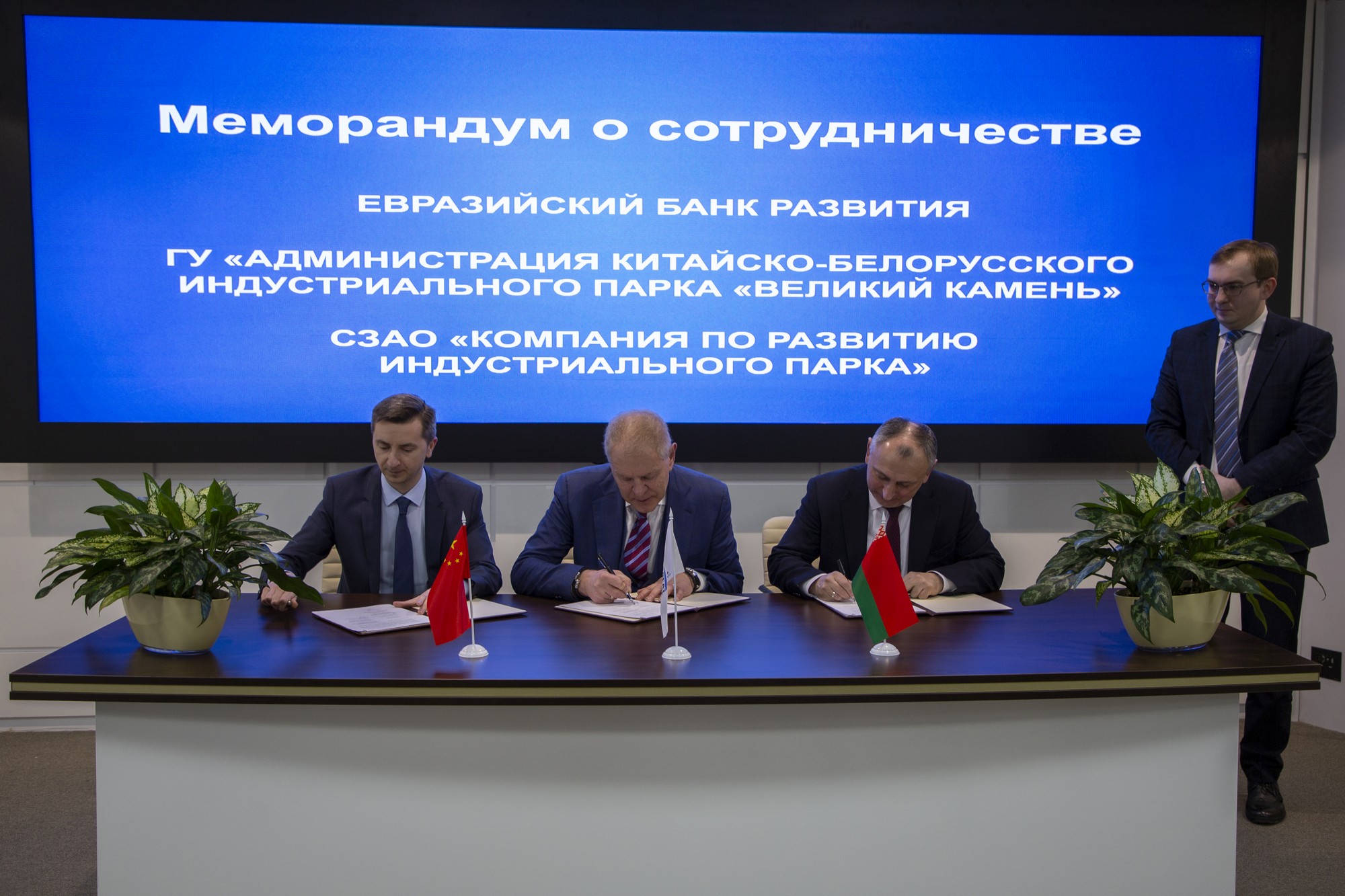2019年2月6日下午,中白工業(yè)園區(qū)管委會(huì)、開發(fā)公司與歐亞開發(fā)銀行(ЕАБР)在新聞發(fā)布廳簽署合作諒解備忘錄(下稱“備忘錄”)。園區(qū)管委會(huì)主任亞羅申科,開發(fā)公司第一副總經(jīng)理卡羅杰耶夫,歐亞開發(fā)銀行副董事長(zhǎng)克賴尼等領(lǐng)導(dǎo)出席本次簽約儀式并共同簽署了備忘錄。