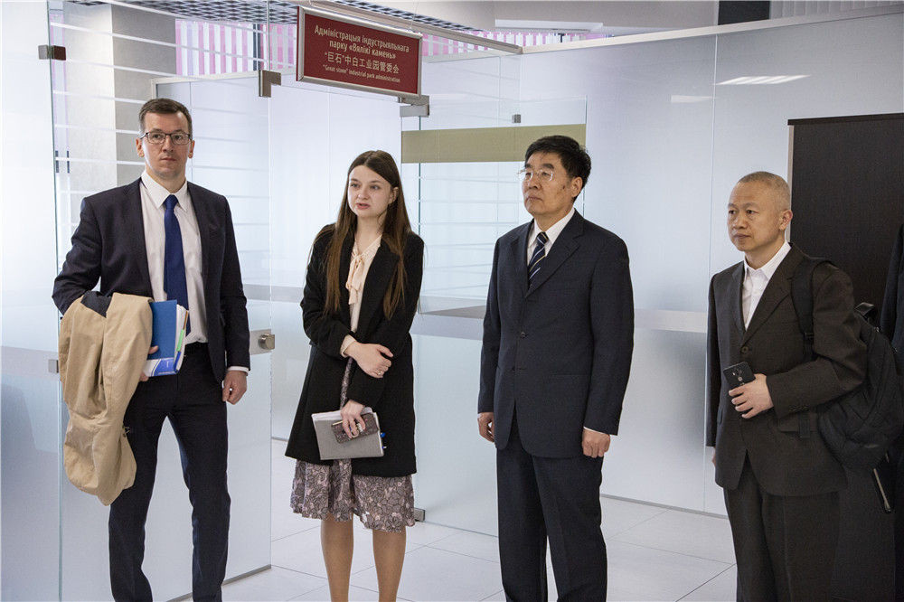 2019年4月24日,國務(wù)院發(fā)展研究中心副主任張軍擴(kuò)考察中白工業(yè)園,并與園區(qū)管委會、開發(fā)公司、入園居民企業(yè)舉行座談會。管委會投資者與入園企業(yè)部部長普列斯尼亞科夫,開發(fā)公司副總經(jīng)理兼總經(jīng)濟(jì)師徐保民陪同考察。