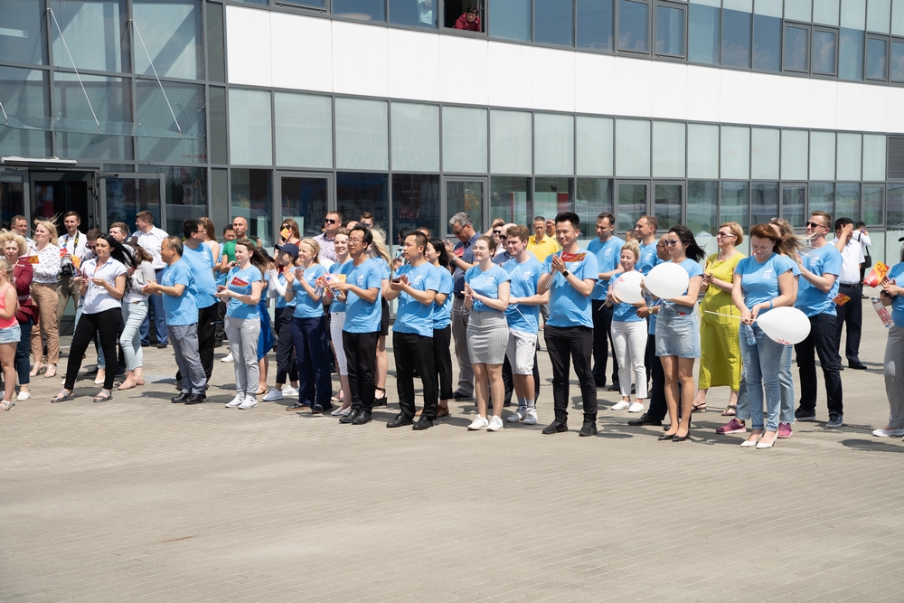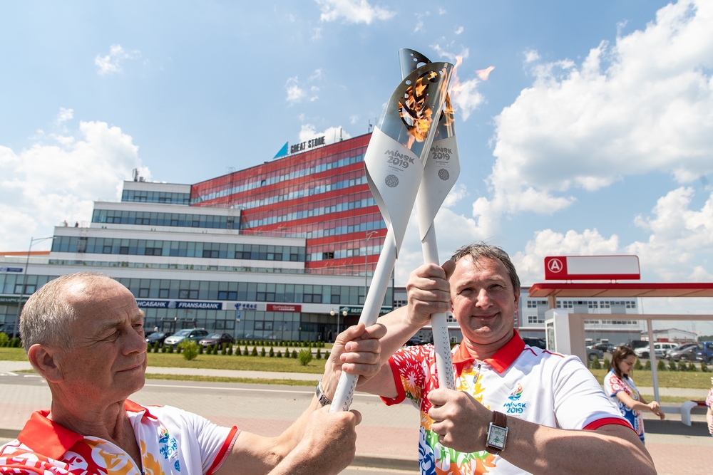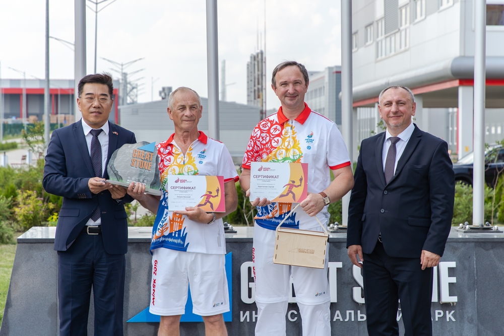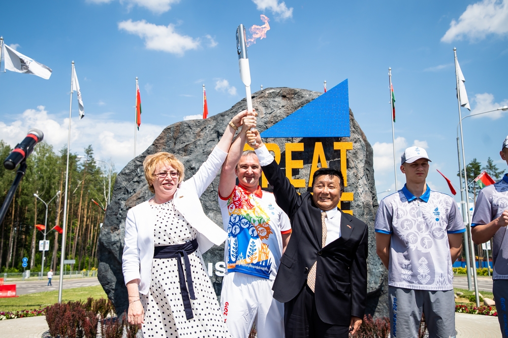 園區(qū)開發(fā)公司CEO胡政、斯莫列維奇區(qū)議員理事會(huì)主席克柳耶娃·瑪林娜和白俄羅斯國立工業(yè)大學(xué)校長哈里東奇克·謝爾蓋共同接過運(yùn)動(dòng)會(huì)圣火并點(diǎn)燃火炬,圣火在園區(qū)明斯克大街、北京大街等主要道路傳遞后,園區(qū)管委會(huì)主任亞羅申科、開發(fā)公司總經(jīng)理李海欣在綜合辦公樓前迎接圣火。
