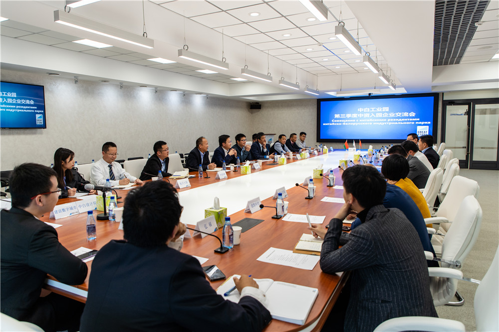 2019年9月18日下午,中白工業(yè)園第三季度中資入園企業(yè)交流會(huì)在園區(qū)辦公樓舉行,開發(fā)公司總經(jīng)理李海欣出席并主持會(huì)議。為服務(wù)于企業(yè)生產(chǎn)與運(yùn)營活動(dòng),開發(fā)公司特邀請(qǐng)白俄羅斯工商會(huì)現(xiàn)場講解產(chǎn)品自產(chǎn)證明和原產(chǎn)地證明等文件的辦理?xiàng)l件及流程。