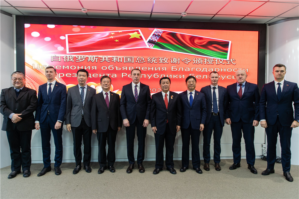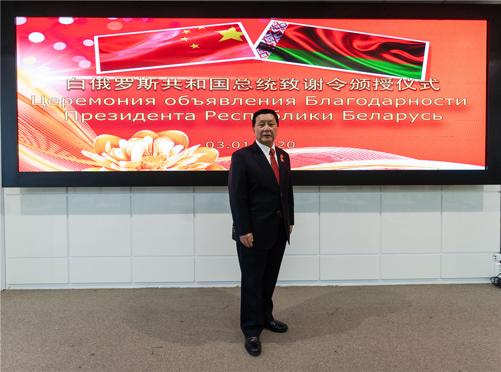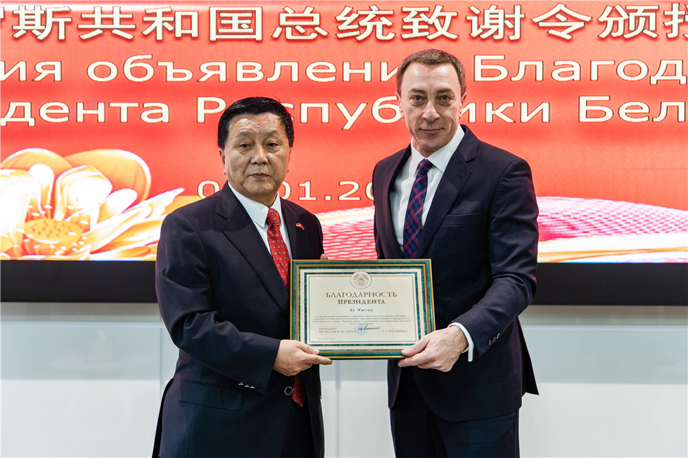 2020年1月3日上午,白俄羅斯總統(tǒng)盧卡申科給胡政的致謝令頒授儀式在中白工業(yè)園隆重舉行。白俄羅斯總統(tǒng)辦公廳副主任、中白政府間合作委員會(huì)白方主席斯諾普科夫親臨中白工業(yè)園開(kāi)發(fā)公司,代表白俄羅斯政府宣讀并頒發(fā)了盧卡申科總統(tǒng)關(guān)于向退休離任回國(guó)的中白工業(yè)園CEO胡政致謝的命令。中國(guó)駐白俄羅斯大使崔啟明、使館政務(wù)參贊羅占輝、經(jīng)濟(jì)商務(wù)參贊楊修敏、集團(tuán)駐白俄羅斯代表處副首席代表、中白工業(yè)園開(kāi)發(fā)公司總經(jīng)理嚴(yán)剛等出席此次儀式。