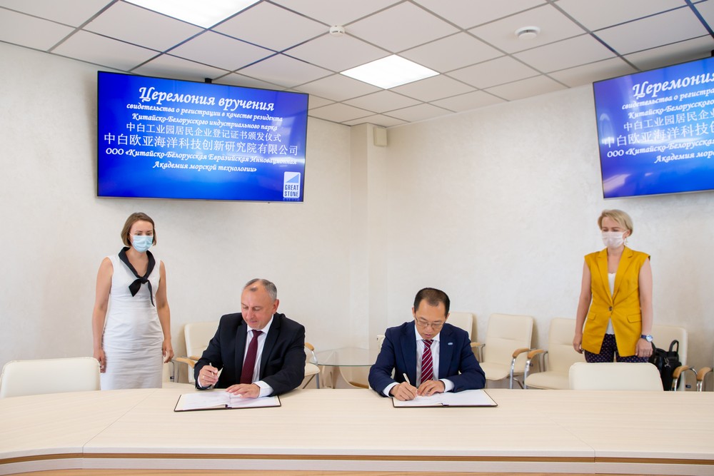 2021年7月21日,中白歐亞海洋科技創(chuàng)新研究院有限公司(以下簡(jiǎn)稱“中白歐亞海洋研究院”)成為中白工業(yè)園第72家入園居民企業(yè),園區(qū)管委會(huì)主任雅羅申科向項(xiàng)目總經(jīng)理史正平頒發(fā)了居民企業(yè)證書,開發(fā)公司總經(jīng)理嚴(yán)剛參加了本次入園儀式。