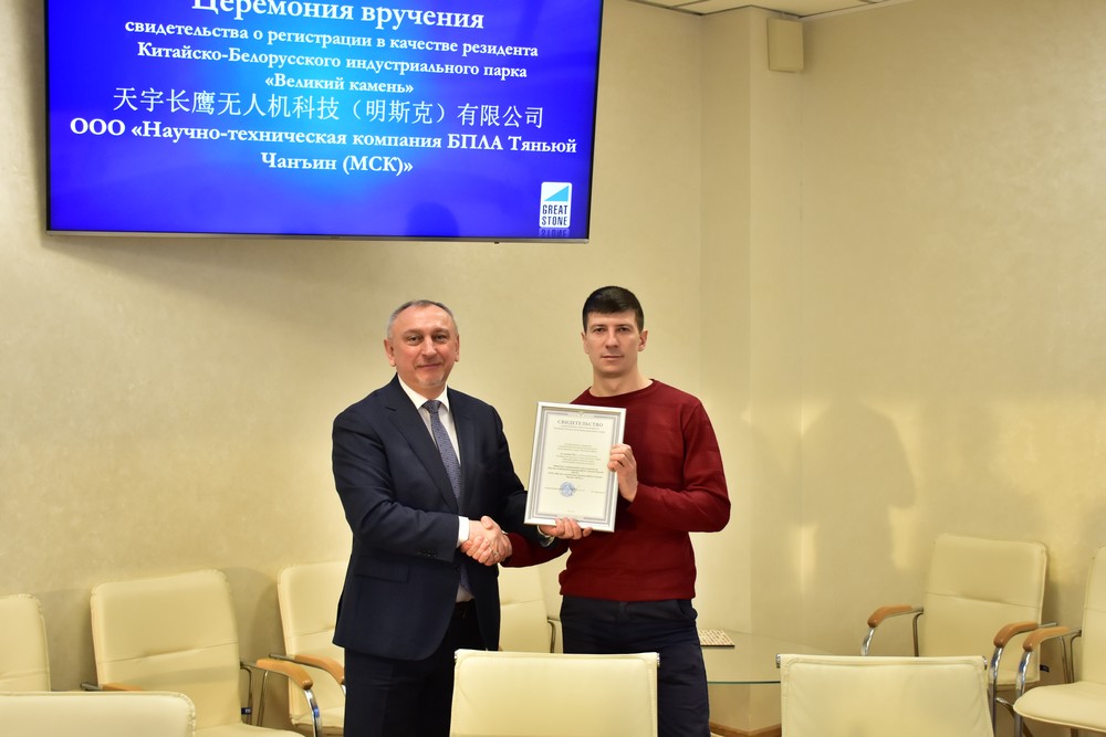 12月21日,天宇長(zhǎng)鷹無(wú)人機(jī)科技(明斯克)有限公司注冊(cè)成為中白工業(yè)園第84家居民企業(yè),園區(qū)管委會(huì)主任亞羅申科為公司總經(jīng)理切列久克·亞歷山大頒發(fā)入園證書,開(kāi)發(fā)公司總經(jīng)理李鐘漢,第一副總經(jīng)理卡羅杰耶夫,副總經(jīng)理維杰霍夫斯基、副總經(jīng)理任飛參加入園儀式。