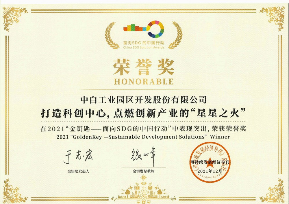 2021年12月21日,2021“金鑰匙——面向SDG的中國(guó)行動(dòng)”發(fā)布典禮以線下線上結(jié)合方式舉辦,現(xiàn)場(chǎng)嘉賓與100多家線上企業(yè)代表匯聚在一起,共同見(jiàn)證了2021“金鑰匙——面向SDG的中國(guó)行動(dòng)”正式發(fā)布的榮耀時(shí)刻。中白工業(yè)園申報(bào)的“建設(shè)可持續(xù)發(fā)展海外園區(qū),貢獻(xiàn)綠色‘一帶一路’”行動(dòng)獲得“四海一家”類別優(yōu)勝獎(jiǎng),“打造科創(chuàng)中心,點(diǎn)燃創(chuàng)新產(chǎn)業(yè)的星星之火”行動(dòng)獲得“驅(qū)動(dòng)變革”類別榮譽(yù)獎(jiǎng)。