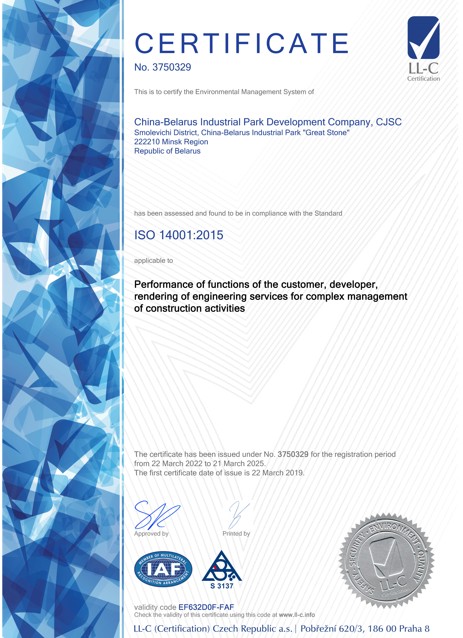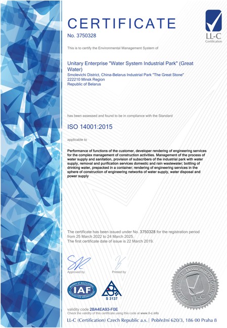 近日,中白工業(yè)園區(qū)開發(fā)公司及水務子公司成功的通過了ISO 14001:2015國際生態(tài)管理體系的再認證,并獲得了有效期至2025年的認證證書。