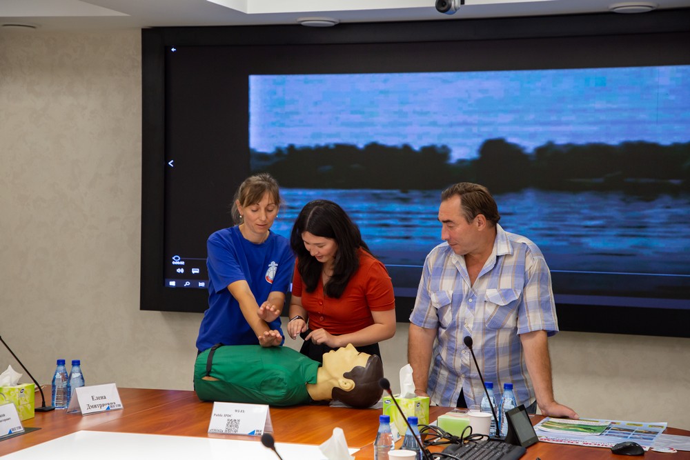 維克多洛維奇介紹到,白俄羅斯夏季水上事故頻發(fā),據(jù)統(tǒng)計(jì),今年上半年白俄羅斯已經(jīng)有超過(guò)230人因溺水死亡。隨后他播放了夏季安全警示宣傳片,并分步驟講解了心肺復(fù)蘇和人工呼吸的溺水急救方法。培訓(xùn)現(xiàn)場(chǎng),員工們圍繞急救的細(xì)節(jié)進(jìn)行了提問(wèn),還在現(xiàn)場(chǎng)利用假人道具進(jìn)行了急救演練。