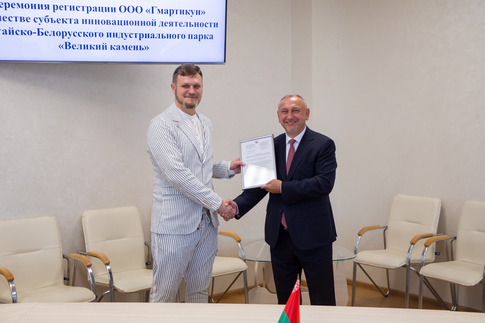 2023年7月26日,中白工業(yè)園舉行初創(chuàng)企業(yè)入園儀式,中白工業(yè)園管委會(huì)主任亞羅申科向白俄羅斯Gmartikun有限公司總經(jīng)理茨布莉斯基頒發(fā)初創(chuàng)企業(yè)入園證書,開發(fā)公司總經(jīng)理李鐘漢參加本次活動(dòng)。