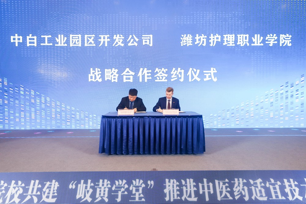 卡羅捷耶夫·基里爾·尤里耶維奇與中國產(chǎn)業(yè)海外發(fā)展協(xié)會會長和振偉、金臺文院院長蔡傳慶、濰坊護理職業(yè)學院黨委書記崔照忠共同為“岐黃學堂”揭牌,并簽署了合作協(xié)議,將在白設立“岐黃學堂”和"岐黃醫(yī)堂"。
