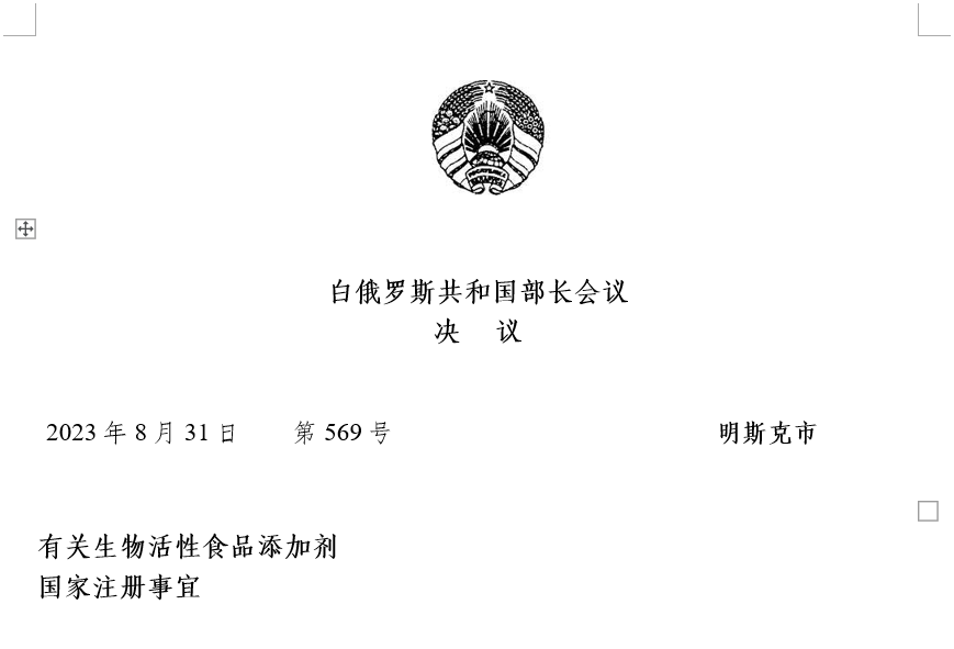 2023年8月31日第569號白俄羅斯共和國部長會議決議對“中華人民共和國產(chǎn)生物活性食品添加劑在白注冊制度”予以批準(zhǔn)。根據(jù)該制度,在中國生產(chǎn)并注冊的生物活性食品添加...202309-05