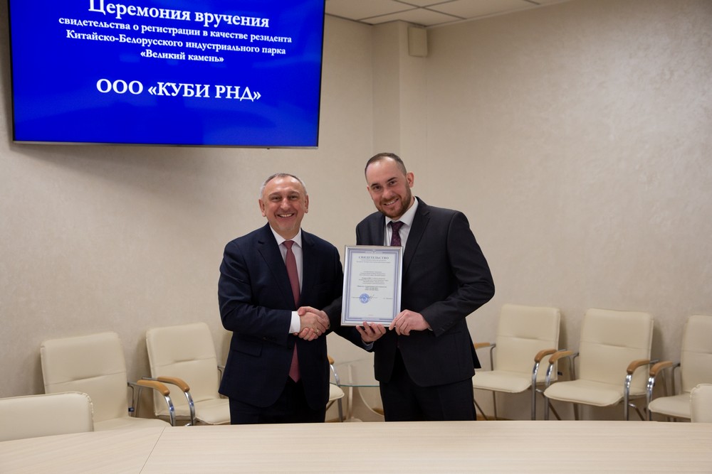 4 月 8 日,CUBY R&D有限責(zé)任公司注冊成為中白工業(yè)園第89家居民企業(yè),園區(qū)管委會主任亞羅申科向CUBY R&D有限責(zé)任公司副總經(jīng)理舍斯塔克·馬克西姆頒發(fā)入園證...202204-08
