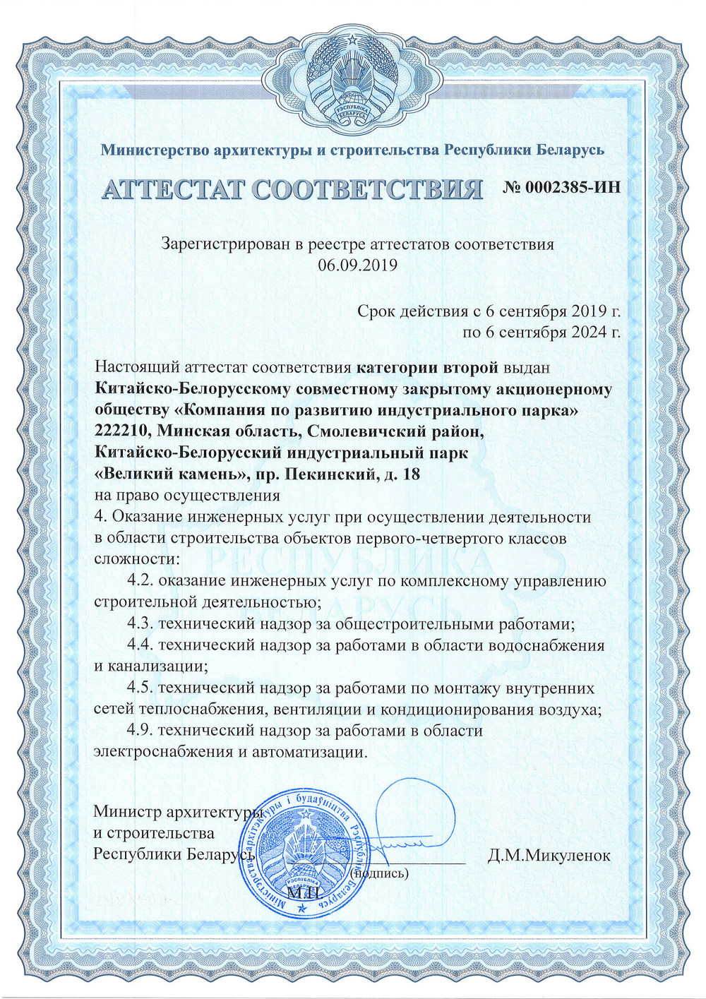 2019年9月6日,中白工園區(qū)開發(fā)股份有限公司獲得白俄羅斯二級工程管理服務(wù)資質(zhì)。據(jù)了解,獲得該資質(zhì)后,開發(fā)公司可為二—四級建筑項(xiàng)目提供相關(guān)工程管理服務(wù),其中包括全...201909-20